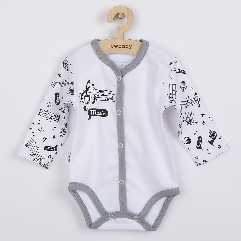 Ontdek de New Baby baby body met een vrolijk muziek thema. Deze stijlvolle romper in wit met grijze randen is perfect voor een kleintje van 0-3 maanden. De speelse muzieknoten en instrumenten geven deze lange mouwen baby bodysuit een originele en feestelijke uitstraling. De handige drukknoopsluiting aan de onderzijde maakt het aan- en uittrekken eenvoudig, terwijl de 100% katoenen fabricage zorgt voor comfort en zachtheid.