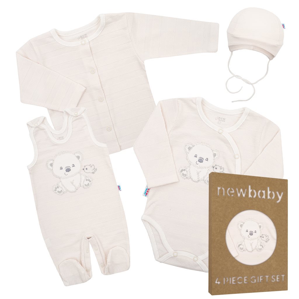 Maak kennis met de schattige New Baby 4-delige kleding set, ideaal voor jouw kleintje. Deze beige babyoutfit bestaat uit een babymuts, onesie, jasje en overall, perfect voor nieuwe ouders. Gemaakt van 100% zachte katoen, biedt deze set het ultieme comfort voor je baby. De onesie en muts zijn voorzien van handige drukknopen voor eenvoudig aankleden en verschonen, terwijl het jasje stijlvol is afgewerkt.